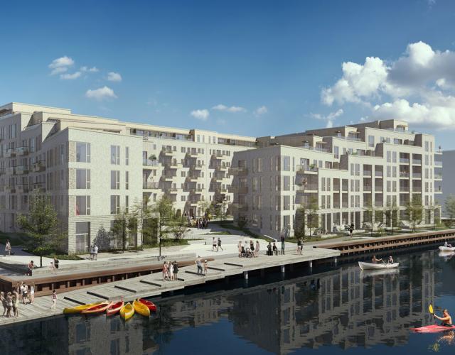 Vandudsigt til alle siderNRE Denmark, der, udover at være del at bygherrekonsortiet, også har rollen som totalentreprenør, forventer en byggetid på 24 måneder. De i alt 181 lejligheder får to, tre eller fire værelser, alle med store vinduespartier og kanaludsigt.